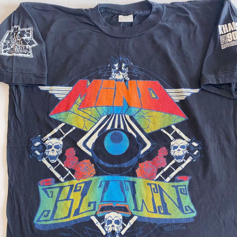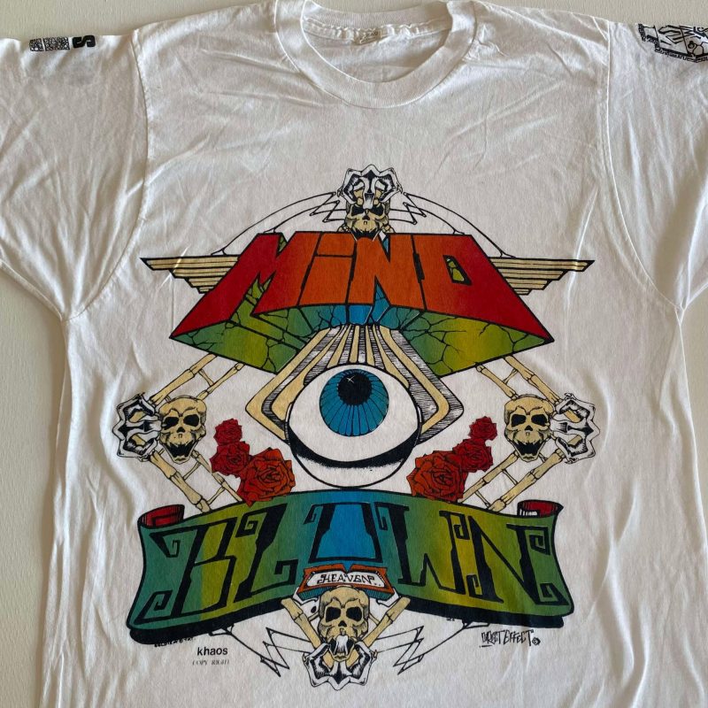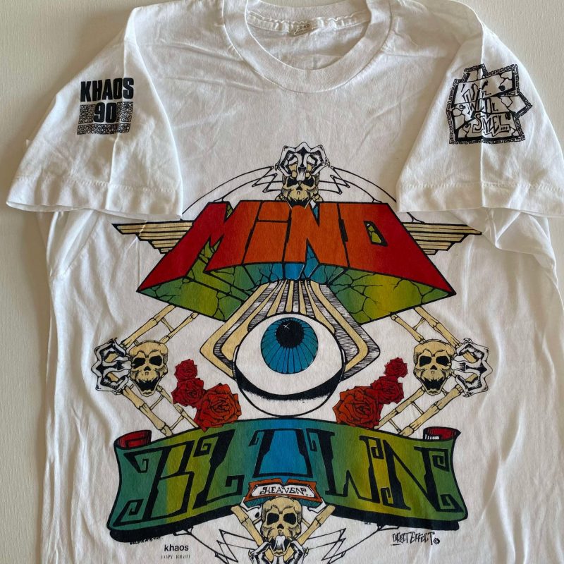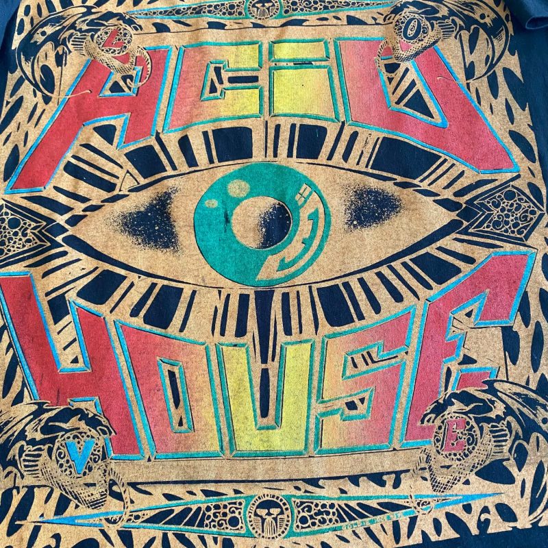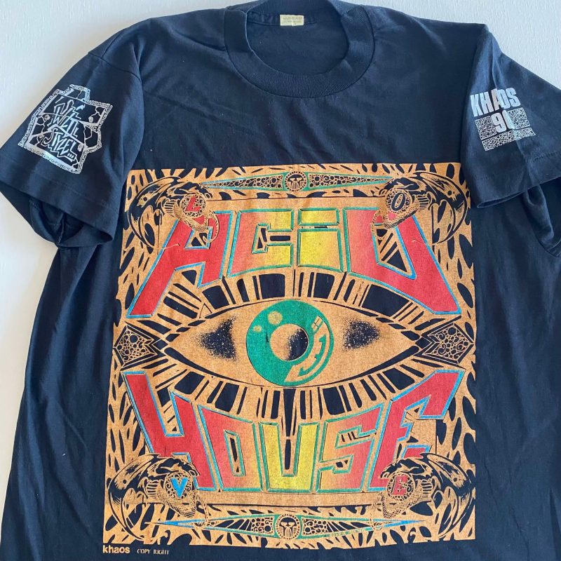 TShirts I Screen Printed for Goldie From Metalheadz . Features a Acid Design. Tye die version of the tshirts were featured in the news paper as the Acid House rave seen was blowing up.