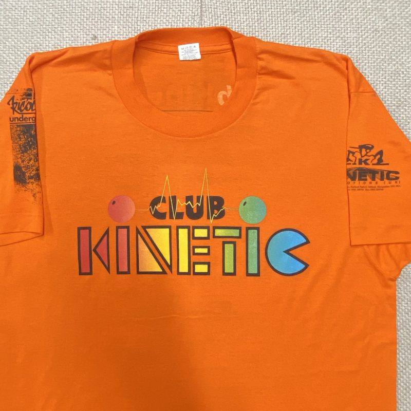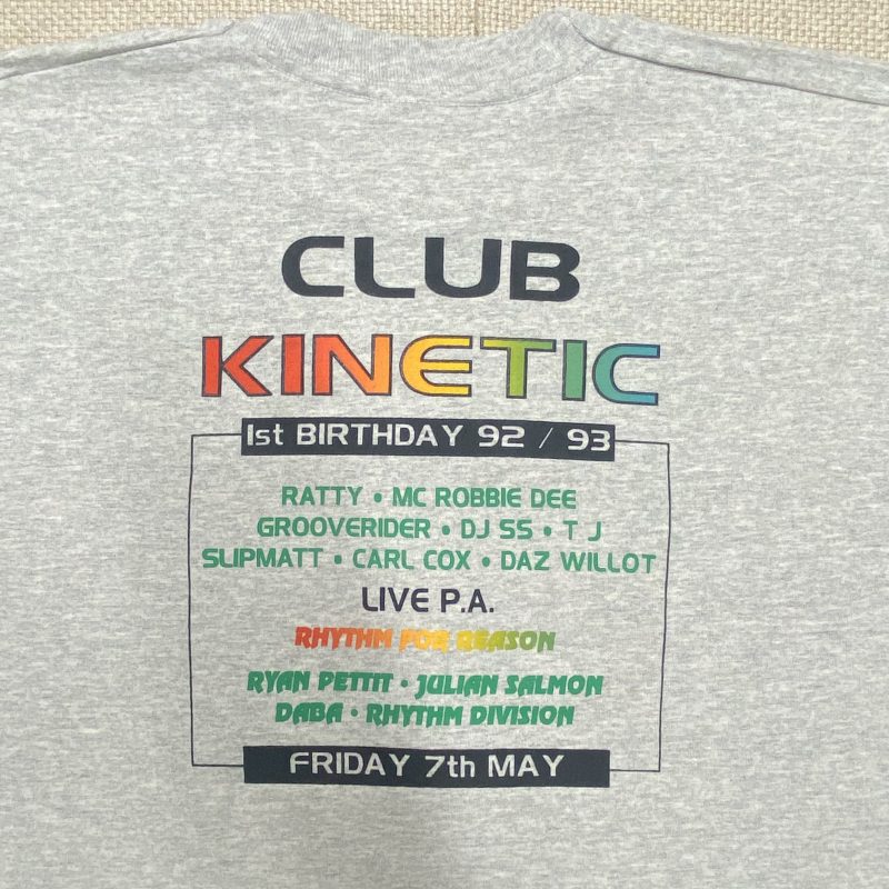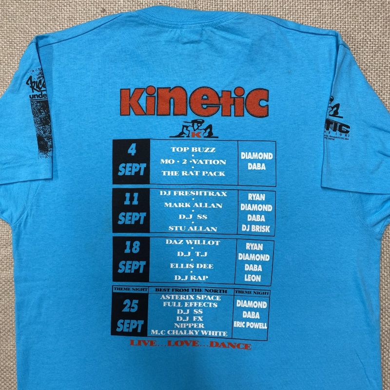I produced staff T-shirts for the Club Kinetic DJ agency, designing and screen printing pieces that represented their roster of top drum and bass DJs. These shirts often featured line-ups and artist names, highlighting the talent available for bookings and reinforcing the agency’s presence within the scene.